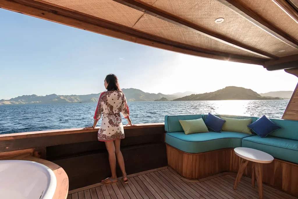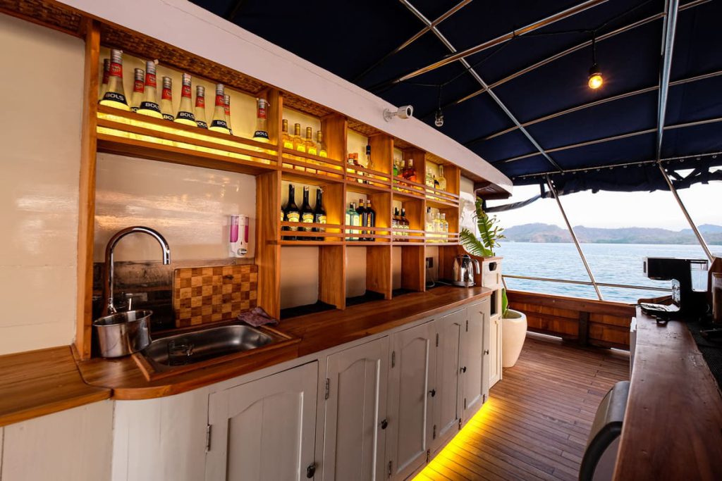The large upper deck is equipped with a well stocked bar and is the perfect area to enjoy juices, cocktails or champagne as you drink in the alluring view where sky and sea meet. There is also a large sultan like day-bed that can host all guests at the same time; one of the reasons why the boat is among the best liveaboard in Komodo for a perfect blend of social.